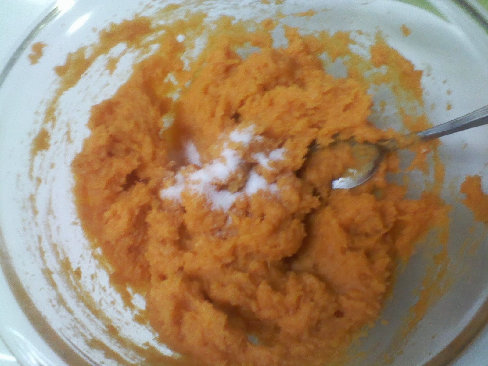 After they cooled (ideally…I was a bit impatient and have the burnt fingers to prove it), you scoop the innards into a bowl and stir until smooth...